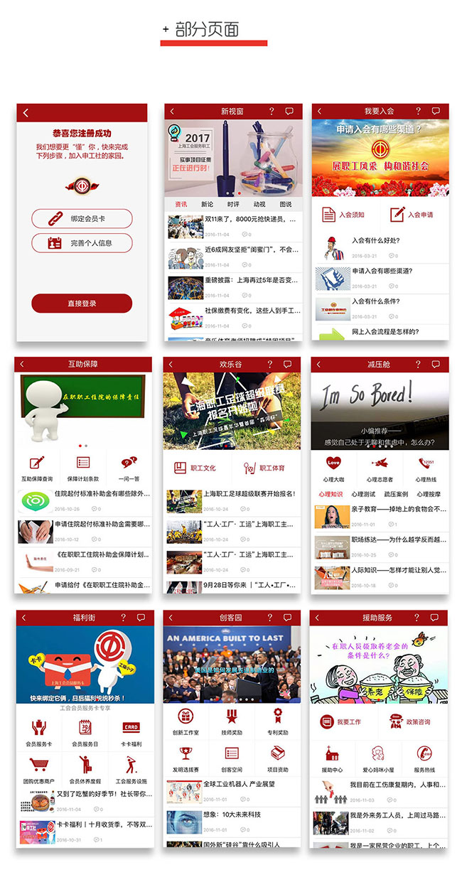 建朗为“申工社”APP设计了15个一级目录、50余个二级目录,在职工入会、维权、保障服务、职业培训、技能升级、职场心理、文化体育等方面为本市广大职工提供全方位面对面的线上服务,力求构建一个“网上职工之家”。