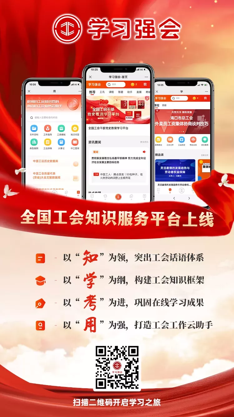 全国工会干部党史学习教育平台,学习贯彻习近平总书记关于工人阶级和工会工作的重要论述学习平台,全总领导报道集,新就业形态劳动者权益维护,全总机关干部赴基层蹲点档案......学习强会,提供及时快捷的工会信息,及时、全面、权威、深度地专题解读工会热点,引领广大工会干部提升政治判断力、领悟力、执行力。