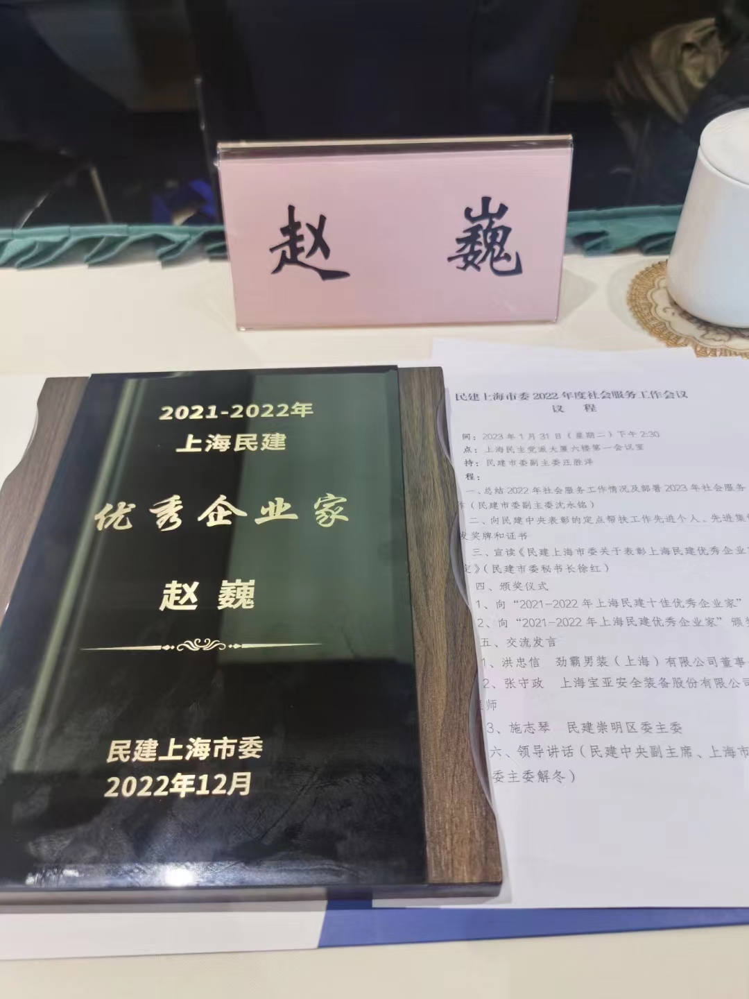 颁奖仪式现场,韦德bevictor董事长赵巍被授予“2021-2022年上海民建优秀企业家”荣誉称号。