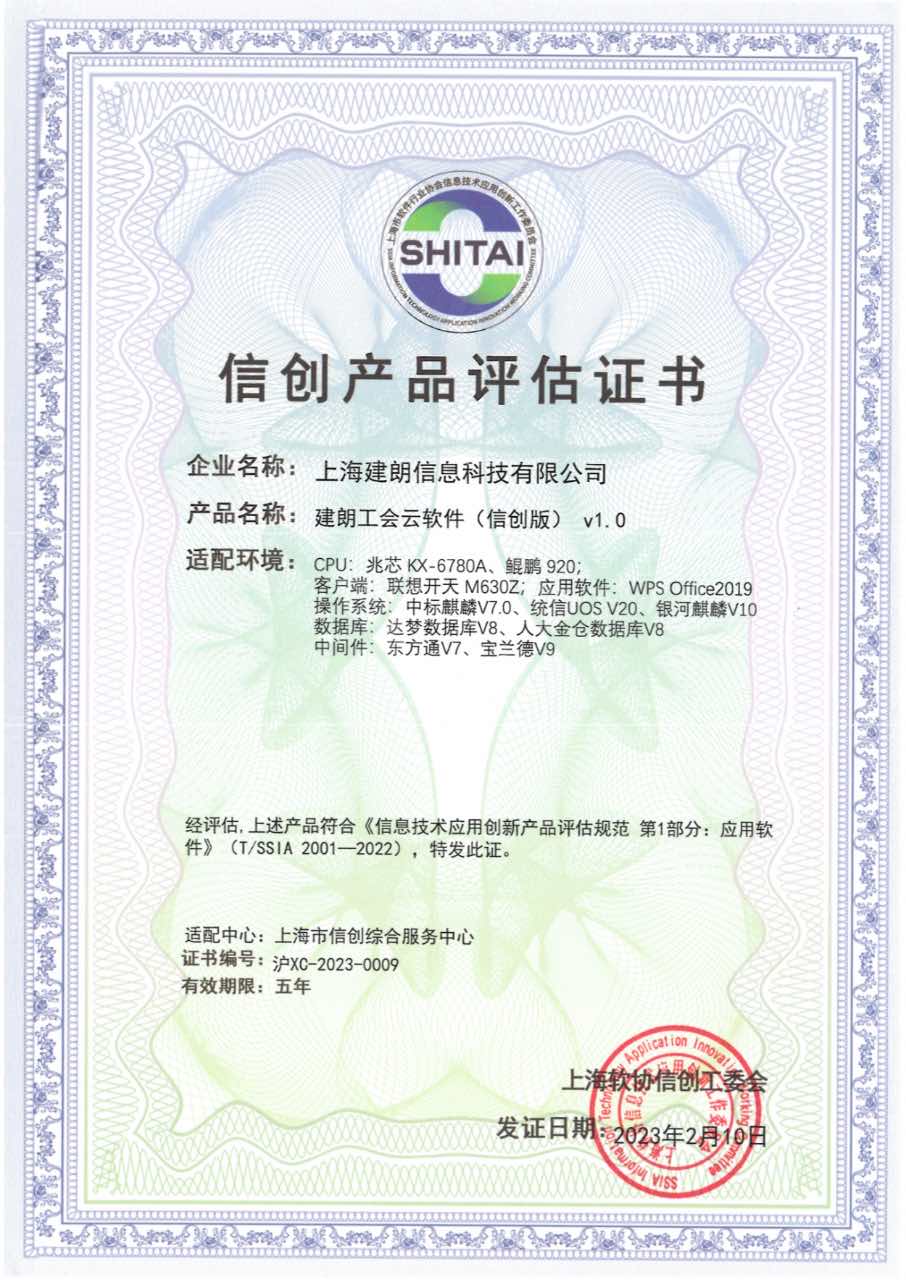 上海市经济和信息化委员会2020年度上海市软件和集成电路产业发展专项资金项目(软件和信息服务业领域)——基于国产软硬件环境的网上工会平台项目已顺利完成专项验收,建朗工会云产品获得上海软件协会信创工委会颁布的信创产品评估官方认证。