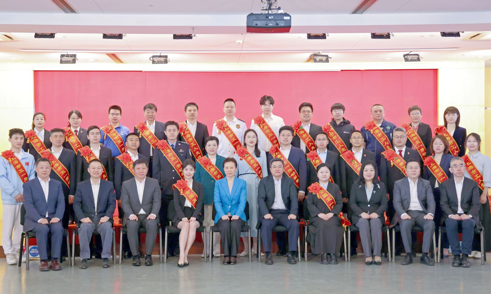 上海市总工会党组书记、副主席沈军,杨浦区区委书记薛侃,杨浦区区委副书记、区长周海鹰等领导与董事长赵巍(第二排从右往左第六位)合影