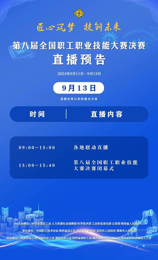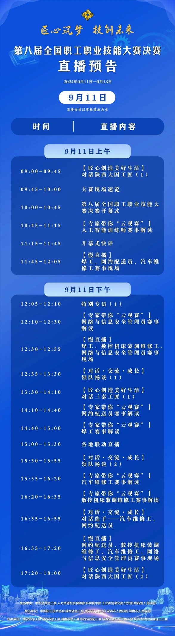 大赛将举办焊工、数控机床装调维修工、网络与信息安全管理员、人工智能训练师、汽车维修工(智能网联新能源汽车方向)、网约配送员6个工种的精彩对决,将有32支代表队齐聚陕西。
